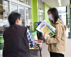 10月22日には、同市在家塚のAコープ白根店で来店者に向けてチラシ50部を配布した。
