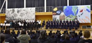 南アルプス・甲西中の3年生は、キッズゲルニカを制作した。同校は2003年、県内で初めてキッズゲルニカの制作に取り組んでいて、戦後80年の節目に、当時制作に携わった教員の発案で22年ぶりに“新作”が発表された。10月31日に同校で披露され、3年生が在校生や保護者らに平和への思いを語りと歌で届けた。