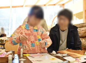 貼り絵をする参加者=南アルプス市芦安芦倉
