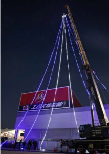 南アルプス市上今諏訪の「エムズ物流」は、同所の同社駐車場で、巨大クリスマスツリーを点灯している。 地域や人々の気持ちを明るくしようと3年前から実施している。青や白の発光ダイオード(LED)約2万球を巻いたワイヤ6本を、クレーン車で45メートルの高さまでつり上げた。ワイヤの頂点には2・5メートルの星も飾っている。 守衛に声をかければ、近くで見ることができるという。 点灯は来年1月4日まで。午後6~11時。強風の日は中止する場合がある。