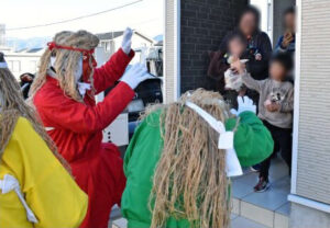 南アルプス市古市場の若宮八幡神社の氏子でつくる「敬神会」は1日、同市古市場、荊沢両地区で「鬼払い」を行った。 会のメンバーが4班に分かれ、鬼に扮して両地区の約600戸を回った。鬼の“襲撃”を受けた住民は「鬼は外、福は内」と言いながら豆を投げた。泣き出したり、懸命に豆を投げたり、子どもたちの反応はさまざま。鬼が逃げた後は、福の神を装ったメンバーが邪気を払った。 鬼役は40~50代の地区男性約40人が交代で務めた。「鬼だぞ鬼だぞ!」と迫力満点に演じた一方、記念撮影を求められると陽気に応じていた。