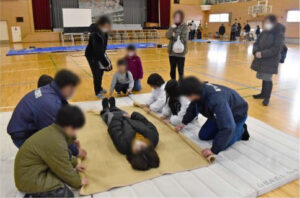 南アルプス市社会福祉協議会は14日、白根飯野小で防災に関する体験型のワークショップを開いた=写真。 「家族で楽しく学ぶ」をテーマに防災への関心を高めてもらおうと企画し、市内の親子約30人が参加。毛布を使った簡易担架の作り方を学んだほか、防災用のリュックサックの中身を考えたり、段ボールベッドなどの防災グッズを実際に使ってみたりした。