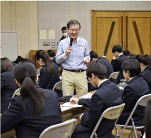 新聞を通じて社会に関心を持ち、将来に役立ててもらおうと企画し、1年生40人が参加した。「新聞から社会と自分を考えよう!」をテーマに、渡辺社長が生徒と一緒に新聞を読みながら、記事の構成や読み方を説明。「将来の職業は、自分の中ではなく社会にある。感度を高く、自分事として新聞を読むことで多くの情報をキャッチできる」などと語った。